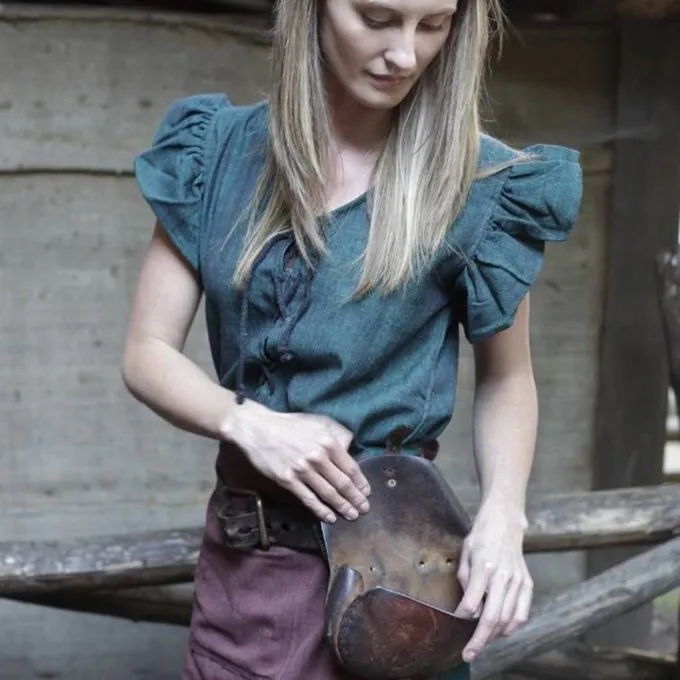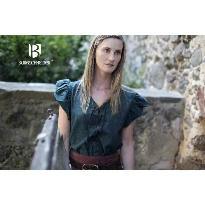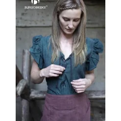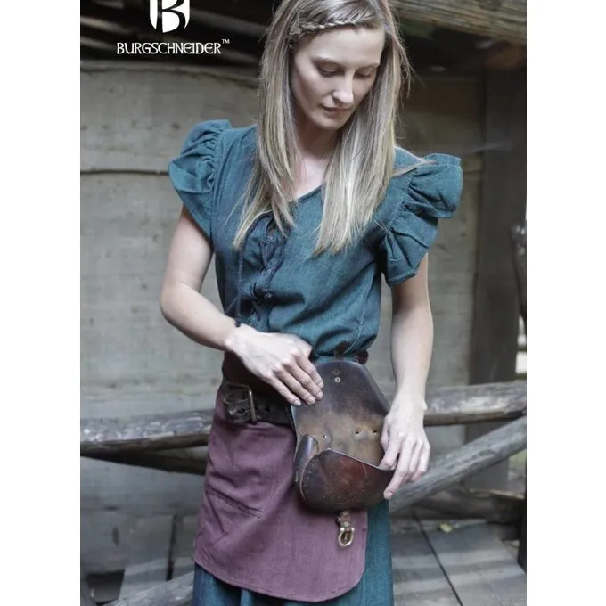 Deze jurk met schort is gebaseerd op hoogmiddeleeuwse voorbeelden. Jurken zoals deze werden gedragen door de lagere klassen. Hij heeft speelse mouwen met ruche en een koord om de hals te sluiten.