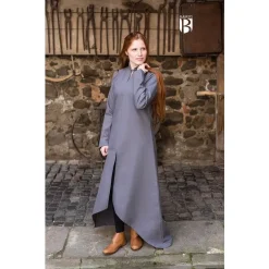 De jurk Ranwen is een veelzijdig design, een echte eyecatcher. De jurk heeft een kraagje die je met een knoop kunt sluiten. De achterkant van de rok reikt tot de grond en aan de voorkant eindigt hij hoog. De voorkant heeft een hoge snit waardoor hij mooi valt. Een spannend design die je los kunt dragen, maar ook kan combineren met een korset, een rok, een mantel of een overjurk. Te gebruiken voor het creëren van mooie LARP, Cosplay en festival outfits.