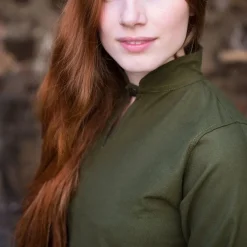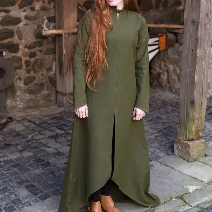De jurk Ranwen is een veelzijdig design, een echte eyecatcher. De jurk heeft een kraagje die je met een knoop kunt sluiten. De achterkant van de rok reikt tot de grond en aan de voorkant eindigt hij hoog. De voorkant heeft een hoge snit waardoor hij mooi valt. Een spannend design die je los kunt dragen, maar ook kan combineren met een korset, een rok, een mantel of een overjurk. Te gebruiken voor het creëren van mooie LARP, Cosplay en festival outfits.
