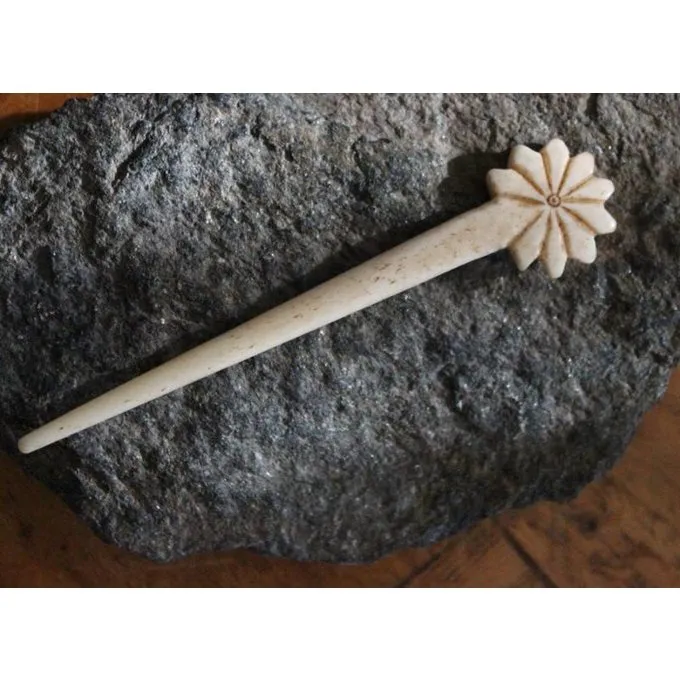 Deze haarpin is gemaakt naar een Romeins exemplaar uit de 1ste-2de eeuw n.Chr. Hij is geheel gemaakt van been. De naald is ongeveer 11 cm lang.