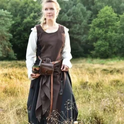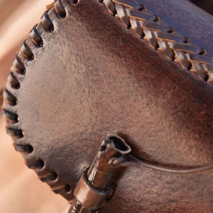 Deze tijdloze leren tas is geschikt voor kostuums van de vroege middeleeuwen tot de 19de eeuw. Hij is ook perfect om je tas en geld in te bewaren tijdens festivals en Comic Cons. Deze mooi gevormde heuptas van hoogwaardig rundleer heeft gepolijste randen en een lichte kleurafwerking, waardoor het leer zijn karakteristieke used-look krijgt. De binnenkant is gemaakt van suede leer en je kan de tas dichtmaken met een lederen knoop.