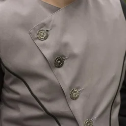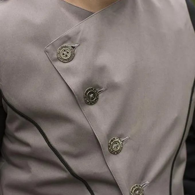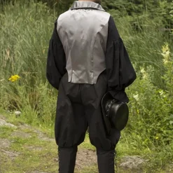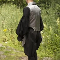 Dit prachtige asymmetrische vest is perfect voor negentiende eeuws re-enactment, LARP en steampunk. Hij is gemaakt in Victoriaanse stijl en makkelijk te combineren met een hemd of jurk om je outfit extra allure te geven. De bovenkant heeft een rij van vier knopen. Je kunt ervoor kiezen om alle knopen te sluiten, of om de kraag open te slaan. De kraag heeft een grijze satijnen binnenvoering dus opengeslagen is deze mooi zichtbaar. De achterkant heeft ook een grijze satijnen voering. Dit vest benadrukt de taille en loopt tot de knieรซn. De voorkant is langer dan de achterkant, wat een speels en mooi asymmetrisch effect geeft.