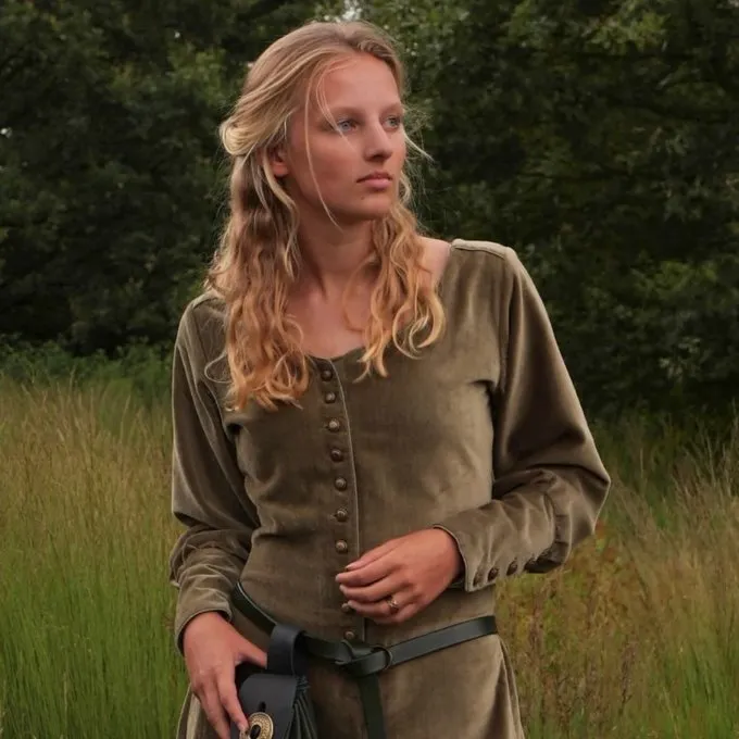 Deze prachtige cotehardie is gemaakt van katoenfluweel en heeft een zeer luxe uitstraling, geschikt voor re-enactment en LARP van adellijke en welgestelde historische figuren en personages. Fluweel kwam in opkomst tijdens de 14de eeuw in Europa en werd vooral in Italië geweven. Bij de middeleeuwse Bourgondiërs waren de geliefde fluwelen kledingstukken een symbool van welvaart en prestige.