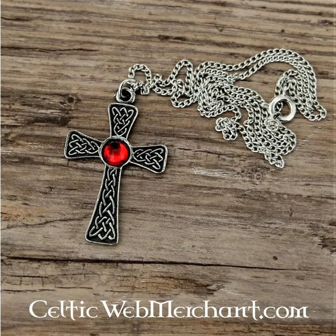 Deze hanger is geïnspireerd op middeleeuwse Keltische kruizen. Hij is versierd met gedetailleerd knoopwerk en heeft een inleg van rood glas. Hij is gemaakt van tin en wordt inclusief zilveren ketting geleverd.