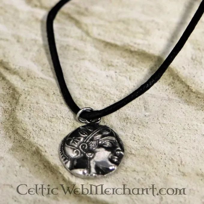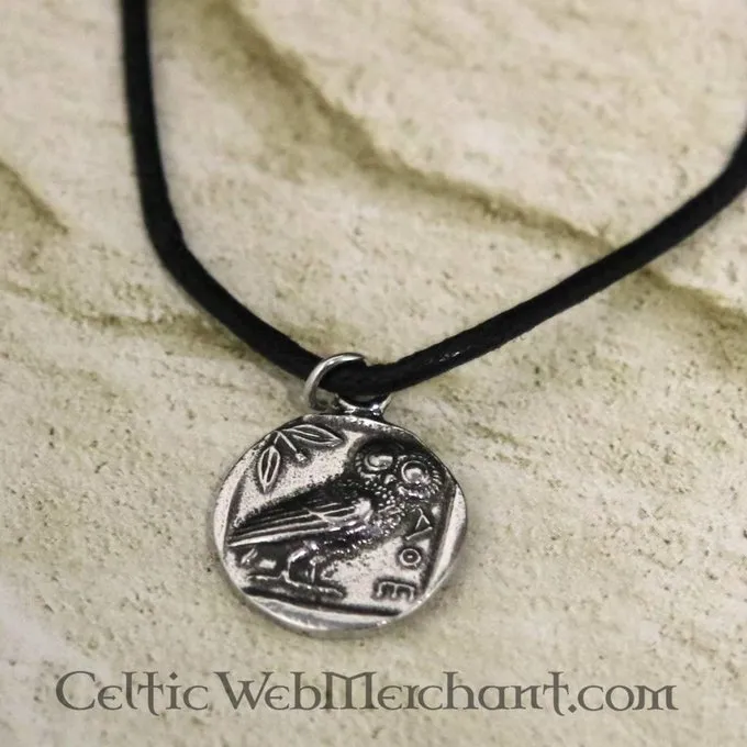 Deze hanger is gebaseerd op een munt uit het oude Athene. De achterkant toont een uil, symbool voor Pallas Athena, de voorkant toont het portret van een vrouw, mogelijk de godin zelf. Deze hanger is gemaakt van tin en wordt geleverd inclusief een gewaxt koordje.