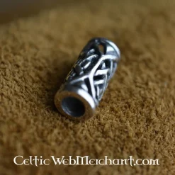 Deze Keltische baardkraal heeft een authentiek Keltisch knoopmotief. Deze baardkraal kan zowel in de baard en in het haar als aan kettingen worden vastgemaakt. Hij is gemaakt van Sterlingzilver, met een diameter van 0,5 cm. De afmeting is 1,6 cm x 0,7 cm.