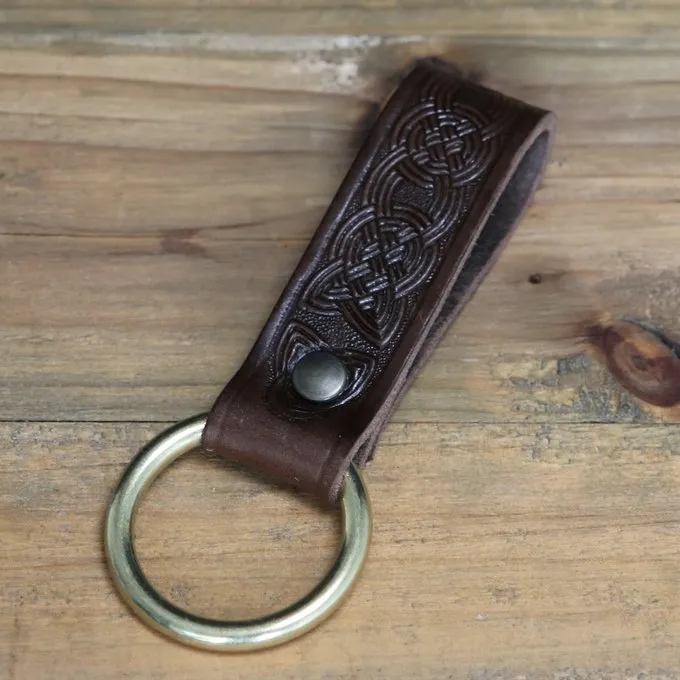 Deze leren houder is bedrukt met een Keltisch knoopmotief. Heb je weinig zakken in je LARP of re-enactment kostuum? Deze houder hang je aan je riem, en aan de ring hang je persoonlijke bezittingen of accessoires. Snel en handig te pakken!