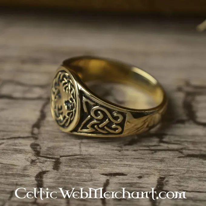 Deze ring heeft een levensboom, Yggdrasil. Hij is geheel handgemaakt van brons en omringd met Keltische knoopmotieven. U kunt uw ringmaat bepalen door de binnendiameter (doorsnee) van een goed passende ring op te meten. De diameter in mm is de juiste ringmaat.