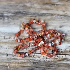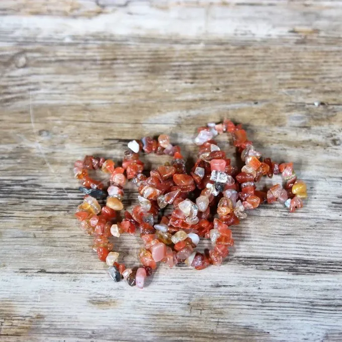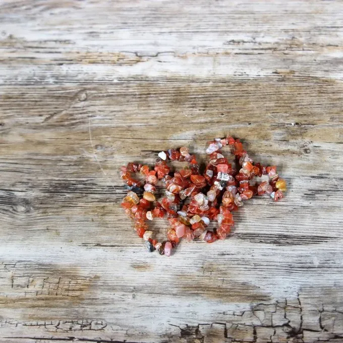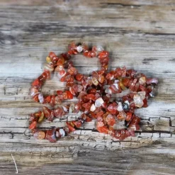 Deze ketting bestaat uit kleine stukjes carneool. Carneool wordt al millennia gebruikt om sieraden van te maken en het is een natuurlijke kwarts. Vanwege de lage prijs van carneool maar de luxe uitstraling kan het goed worden gebruikt als semi-edelsteen voor historische reconstructies in plaats van het duurdere amber. Het dragen van carneool zou de drager succes brengen, helpt tegen depressie, ruzie en geeft motivatie en zelfvertrouwen.