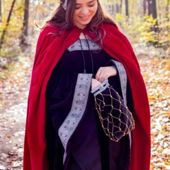 Deze luxe buidel kan worden gebruikt voor Middeleeuwse en Renaissance re-enactment. Hij maakt de outfit compleet van een rijke koopvrouw, een edelvrouw, aristocrate of een koningin. De fluweelachtige stof van de buidel is gedecoreerd met een patroon van imitatie gouddraad en imitatieparels. Hij wordt afgemaakt door het uitbundig versierde bovenrandje, dat doet denken aan een luxe wandtapijt dat in de woning van een adellijke figuur had kunnen hangen.