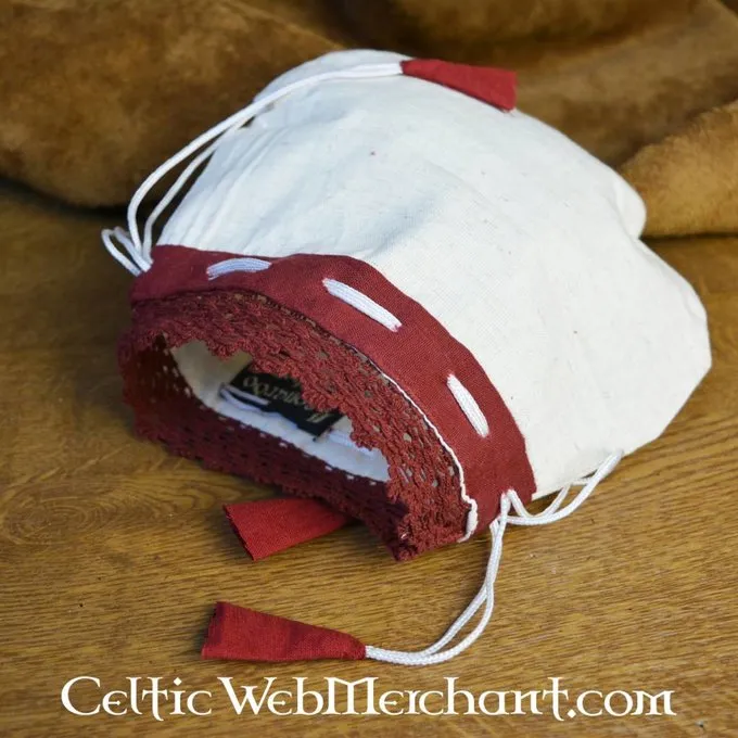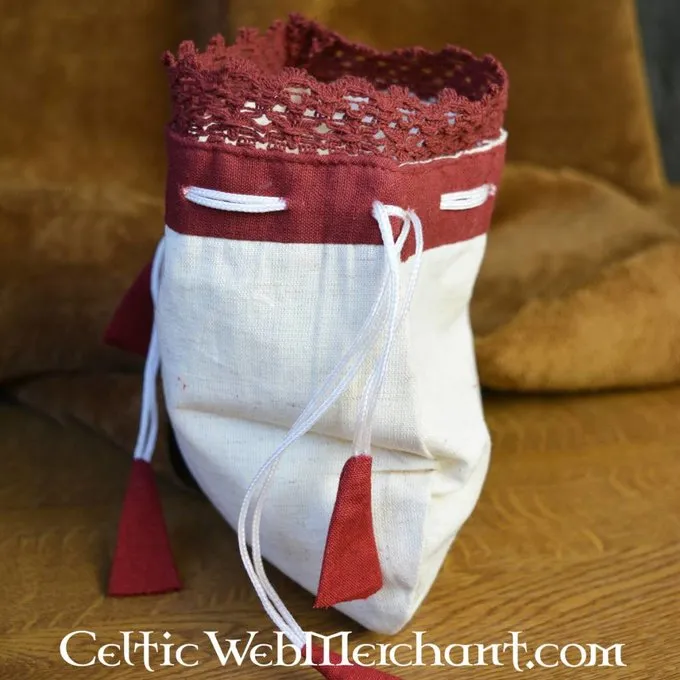 Deze elegante geldbeurs complimenteert de outfit van iedere dame. De sierlijke bovenkant is afgezet met een kantpatroon en het koordje dat de beurs sluit heeft speelvolle rode details. De perfecte accessoire voor dames die de Middeleeuwen of Renaissance re-enacten.