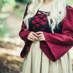 Deze jurk is gemaakt in laatmiddeleeuwse en renaissance stijl, met een dichtgesnoerd lijfje over een contrasterende kleur onderjurk, wijdvallende mouwen, en een wijdvallend schort. Een geweldige jurk geschikt voor re-enactment, LARP en Cosplay van middeleeuwse stedelingen, waardinnen, marktkoopvrouwen, etc. Vrouwen droegen overdag een schort om de kleding te beschermen tegen viezigheid tijdens het schoonmaken. Ook waren de middeleeuwse steden niet schoon, dus bij een uitstapje naar de markt diende de kleding beschermd te worden tegen opwaaiend stof. Deze jurk kan je aan de achterkant dichtsnoeren. Ook aan de voorkant kan je het lijfje strakker dichtsnoeren voor een strakkere pasvorm.