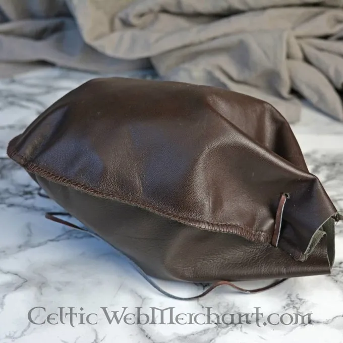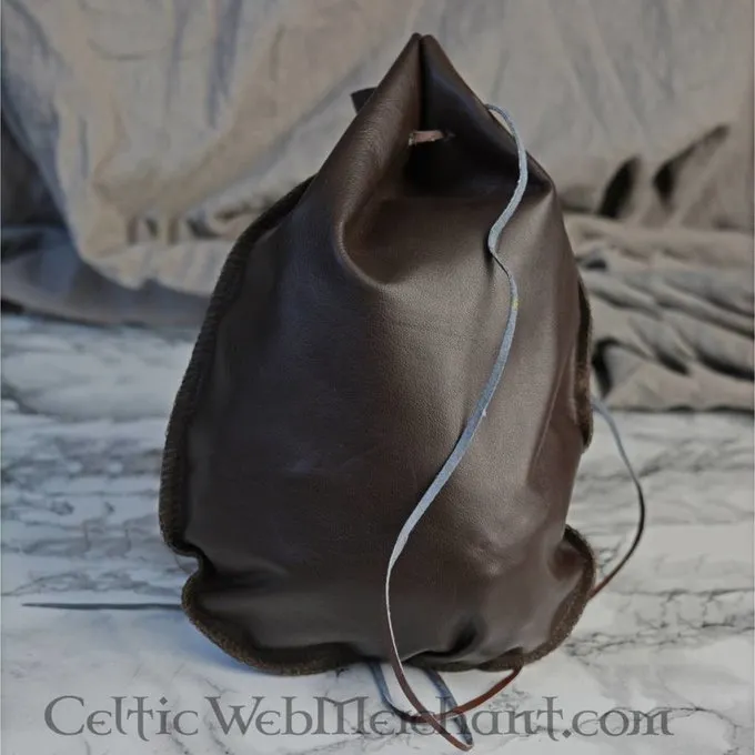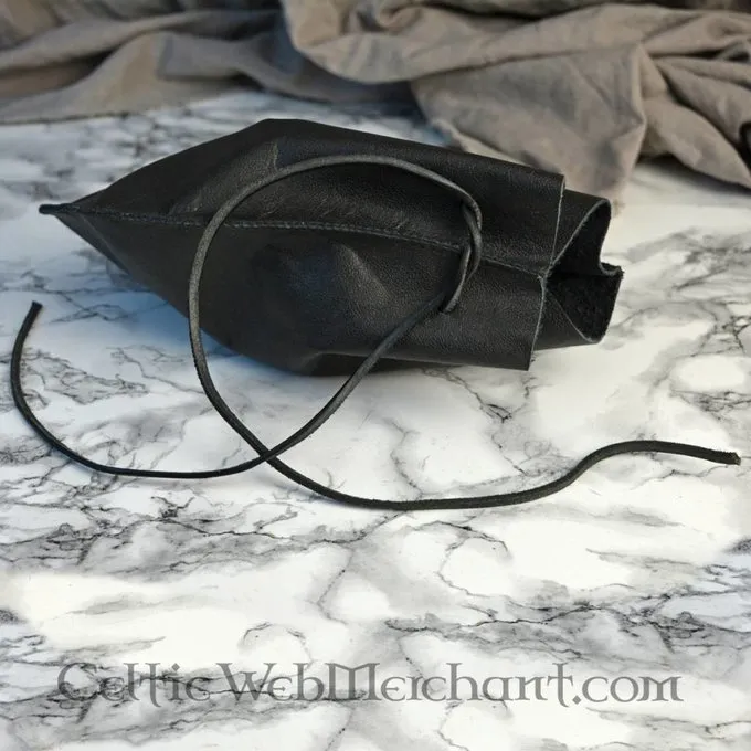 Deze geldbeurs is gebaseerd op verschillende middeleeuwse originelen. Hij kan worden gesloten met een leren veter en aan een riem worden gehangen.