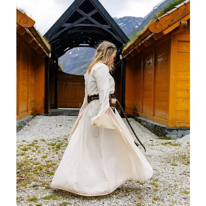 Deze Middeleeuwse jurk heeft indrukwekkende wijde mouwen. Van oudsher was dit een teken van rijkdom. Deze jurk is ideaal voor een Laatmiddeleeuwse of natuurlijk fantasy outfit. Hij kan goed worden gecombineerd met over jurken en met verschillende textielen en leren riemen. Op de volgende middeleeuwse markt ben je in ieder geval goed gekleed met het simpele maar opvallend mooie borduursel op de jurk!