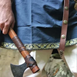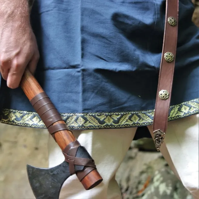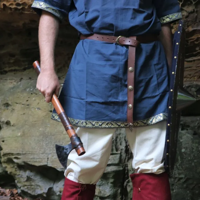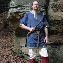Deze lange tuniek met korte mouwen heeft elegante borduursels die gebaseerd zijn op middeleeuwse patronen in gouddraad.