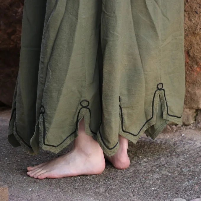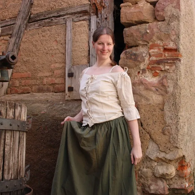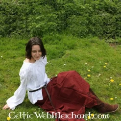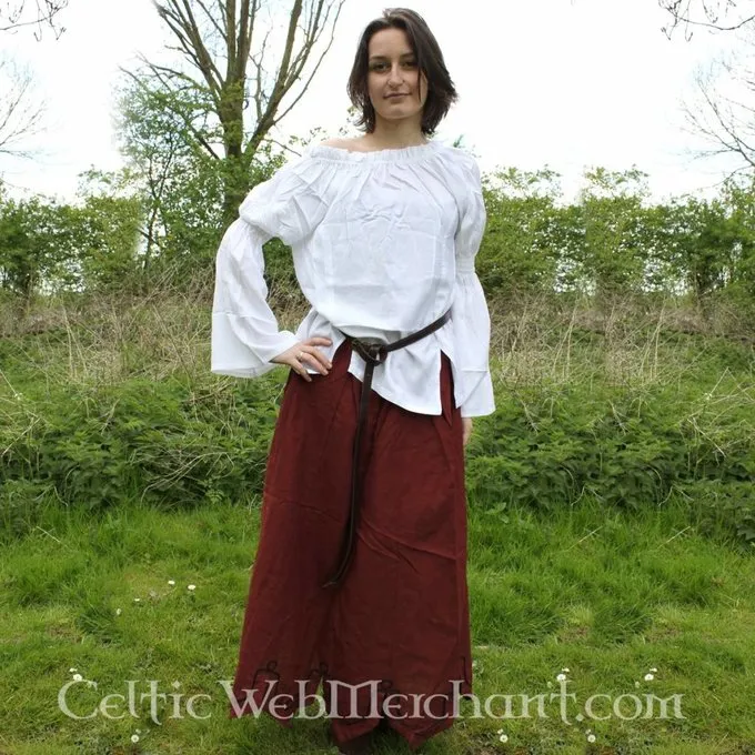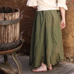 Deze rok is gemaakt van een ongebleekte katoen-linnenmix. De onderkant is gekarteld tot een typisch renaissance-uiterlijk. Hij is verkrijgbaar in crème, groen, bruin, rood en blauw in maat S-M, L-XL en XXL.