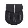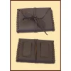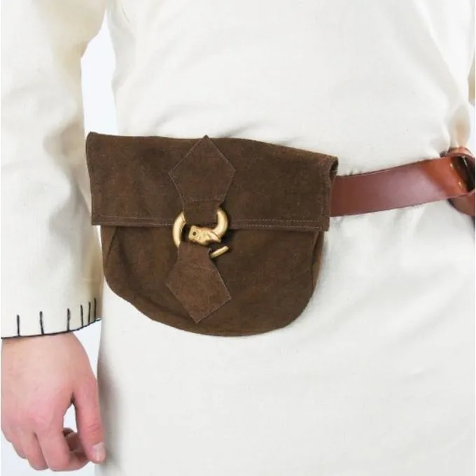 Dit tasje is gemaakt van veloursleder en heeft een messingen gesp met een wolvenkop. De achterkant van het tasje heeft twee lussen waarmee hij aan een riem van max. 5 cm breed kan worden gehangen.