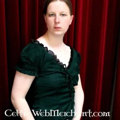 Deze top is gemaakt van viscose en is gevoerd met satijn. Hij is aan de voorkant dicht te rijgen met een veter en heeft een kleine kraag. Hij is verkrijgbaar in de maat S t/m XXXL.