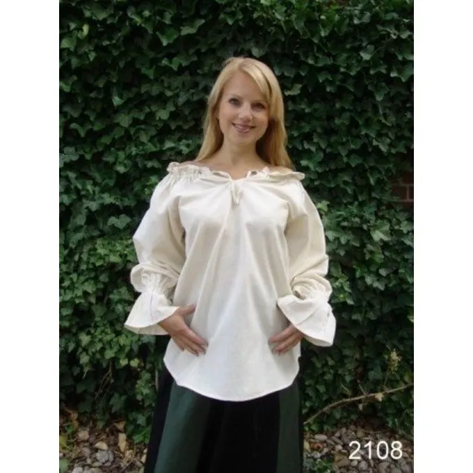 Deze top heeft lange mouwen. Rond de pols en de hals zit elastiek. De hals is dicht te maken met twee koordjes. Verkrijgbaar in wit (crème) en zwart in maat S t/m XXXL.