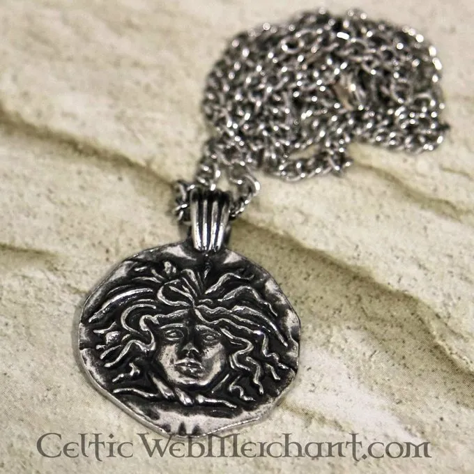 In de Griekse mythologie was Medusa een Gorgoon, een vrouwelijk monster met haar van levende slangen. Iedereen die haar zag, versteende. Medusa’s hoofd werd een symbool voor het afweren van kwaad. Deze hanger is gemaakt van tin.