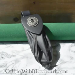 Deze geldbeurs is gebaseerd op middeleeuwse originelen van rond 1400. Het zachte leer wordt dichtgetrokken met een leren veter, waaraan de decoratieve gesp is bevestigd. De gesp sluit de beurs door hem door een gleuf in de klep te schuiven. De beurs is gemaakt van 1 mm dik runderleer en heeft een klep van 2 mm dik. De riemlus is geschikt voor een riem tot 7 mm breed. De beurs is 17 x 13 cm groot.