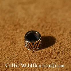 Deze bronzen baardkraal heeft een unieke vorm en is gegraveerd met een Viking knoopmotief, hij is ca. 6 x 9 mm, en weegt 1,30 gram. Ook mooi aan armbanden of kettingen.