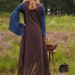 De surcotte, oorspronkelijk als overkleed gedragen door manne, werd vanaf de dertiende eeuw populairder onder vrouwen. Het kledingstuk is bedoeld om over een ander kledingstuk te dragen. De armgaten van de surcotte werden steeds groter, dit was een populair modestatement. Uiteindelijk reikten de gaten tot de heupen, zoals bij deze surcotte, en kon je de onderjurk eronder zien. De middeleeuwse kerk vond deze mode niet kuis, en noemde de armgaten ‘de poorten van de hel’. Deze surcotte is gemaakt van stevig canvaskatoen waardoor het kledingstuk geschikt is voor in de lente en herfst. De zomen zijn voorzien van een fijn geweven katoenen rib. De armgaten reiken tot de heupen. De surcotte staat het mooist in combinatie met een riem en onderjurk. Een perfect kledingstuk voor re-enactment en LARP van de dertiende t/m vijftiende eeuw.