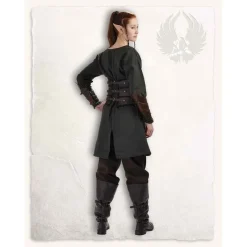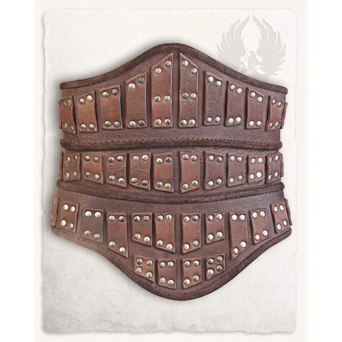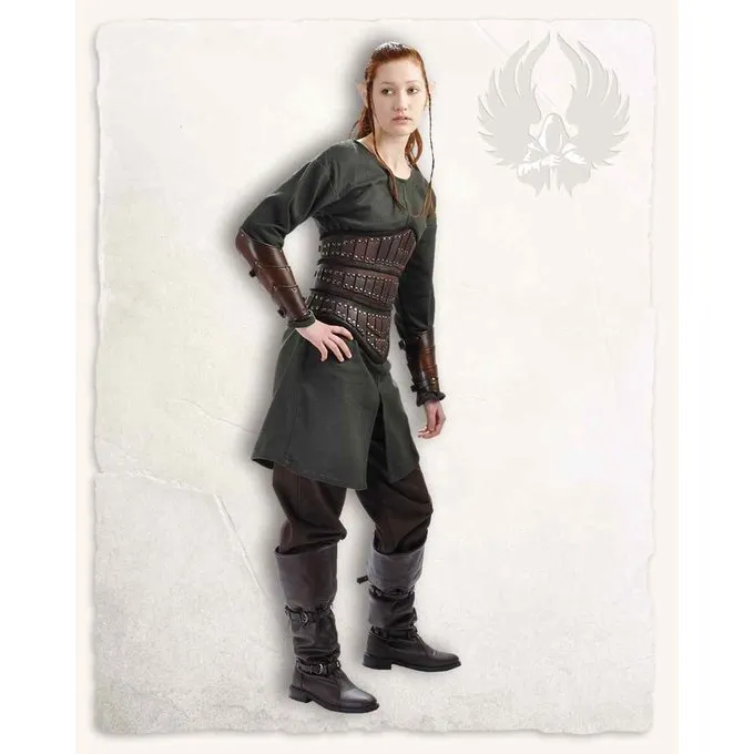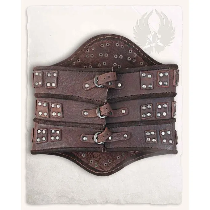 Het korset Evandra is gemaakt van comfortabel zacht bovenleer en wordt aan de achterkant gesloten met drie gespen. De zomen langs de naadlijnen aan de onderkant, bovenkant en de twee in het midden geven een mooie accentuering aan de taille. Door de geklonken leren schubben ziet de drager eruit als een echte krijger. Perfect voor een LARP bijeenkomst of een middeleeuws festival.
