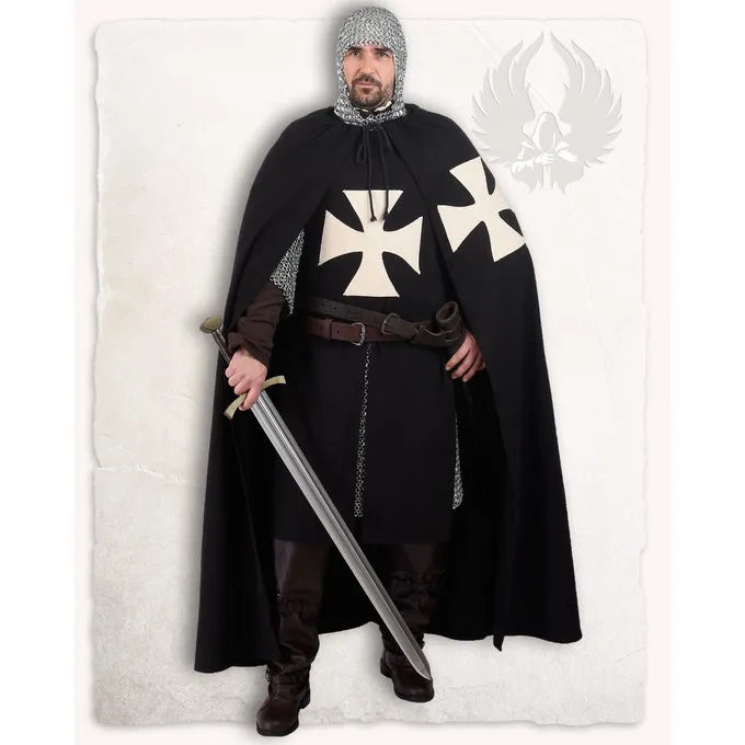 Deze mantel is geschikt voor reenactment, cosplay en LARP. De mantel is gemaakt van zwaar katoen canvas, dit beschermt de drager extra goed tegen weer en wind. De mantel kan gesloten worden met het touwtje om de nek. De mantel is gemaakt van veel stof en biedt dus veel ruimte aan de drager om zich helemaal te kunnen wikkelen in de mantel. Op de mantel zelf staat het kruis van de Hospitaliers.