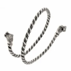 Deze armband is gebaseerd op houtsnijwerk gevonden bij het 8ste eeuwse bootgraf van het Osebergschip in Noorwegen. Deze prachtige drakenkoppen zijn verwerkt in een bovenarmband. De bovenarmband is gemaakt van verschillende in elkaar geweven staven. In totaal is de armband 48 cm lang. Hij kan goed op maat worden versteld en is ook geschikt voor gespierde bovenarmen.