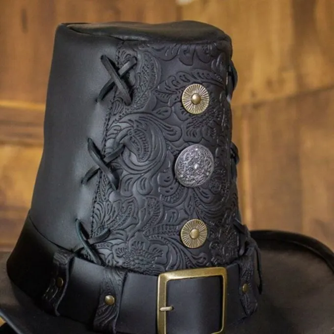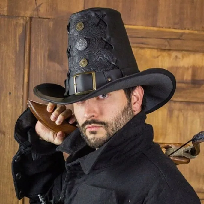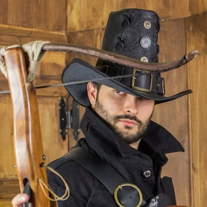 De hoeden van de Spaanse fabrikant Rawblade zijn gemaakt van hoogwaardig leer. Traditioneel vakmanschap en de hoogste kwaliteitsnormen garanderen een lange levensduur en vormvastheid. Een leren hoed is een trouwe metgezel bij slecht weer en een essentieel accessoire voor veel kostuums. Deze hoed is perfect voor Witch Hunter en 18de-19de eeuwse kostuums, en voor allerlei Cosplays en LARPs. Dit is de deluxe versie, met prachtige leerdecoraties en een handgestikte afwerking.