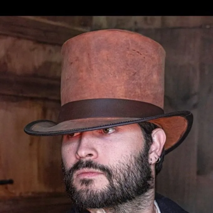 Deze hoed is een replica van modellen die in de 18de eeuw wereldwijd populair waren. Deze hoeden worden handgemaakt door de Spaanse fabrikant “Rawblade” zijn gemaakt van hoogwaardig leer. Traditioneel vakmanschap en de hoogste kwaliteitsnormen garanderen duurzaamheid en maatvastheid. Een leren hoed is een trouwe metgezel bij slecht weer en een expressieve accessoire voor veel kostuums. Deze hoed is een hoge hoed en zeer geschikt voor narren, duistere karakters, maar ook echte heren, “Steampunk” en 18de-19de eeuwse kostuums.