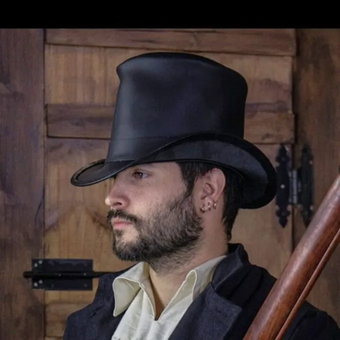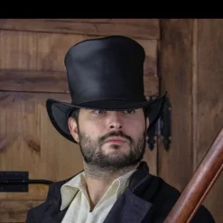 Deze hoed is een replica van modellen die in de 18de eeuw wereldwijd populair waren. Deze hoeden worden handgemaakt door de Spaanse fabrikant “Rawblade” zijn gemaakt van hoogwaardig leer. Traditioneel vakmanschap en de hoogste kwaliteitsnormen garanderen duurzaamheid en maatvastheid. Een leren hoed is een trouwe metgezel bij slecht weer en een expressieve accessoire voor veel kostuums. Deze hoed is een hoge hoed en zeer geschikt voor narren, duistere karakters, maar ook echte heren, “Steampunk” en 18de-19de eeuwse kostuums.