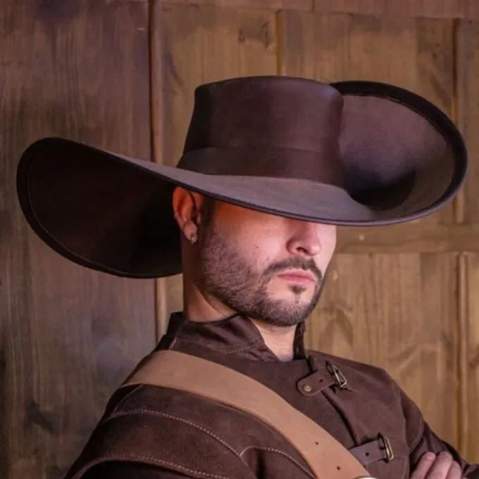 De hoeden van de Spaanse fabrikant Rawblade zijn gemaakt van hoogwaardig leer. Traditioneel vakmanschap en de hoogste kwaliteitsnormen garanderen een lange levensduur en vormvastheid. Een leren hoed is een trouwe metgezel bij slecht weer en een essentieel accessoire voor veel kostuums. Deze hoed is perfect voor musketiers kostuums. De hoed heeft een wijde rand, ideaal om je in de schaduwen te verbergen voor je vijand. Een geweldige hoed om duels mee uit te vechten.