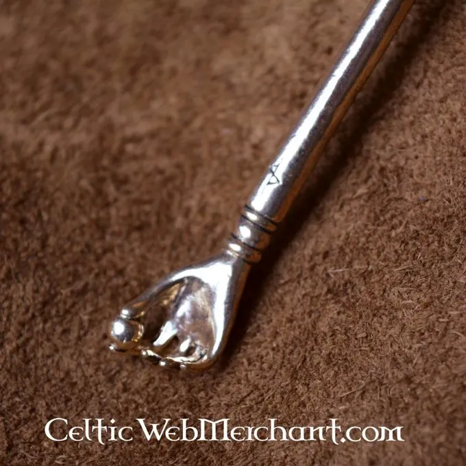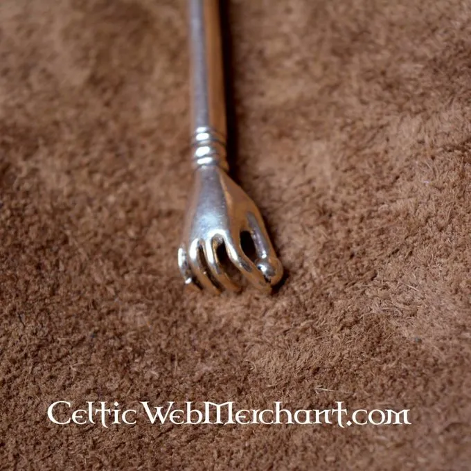 De hand kan worden geassocieerd met de Romeinse god Jupiter. De haarpin is gemaakt van bronskleurig brons en is 14,5 x 1,3 cm groot.