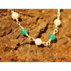 De ketting bestaat uit afwisselend turquoise glazen kralen en zoetwaterparels. De ketting zelf is gemaakt van Sterlingzilver.