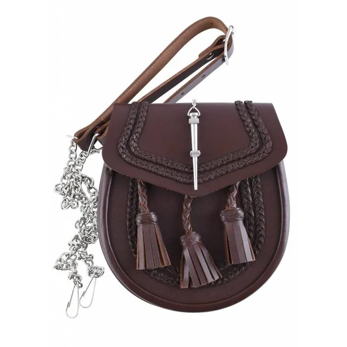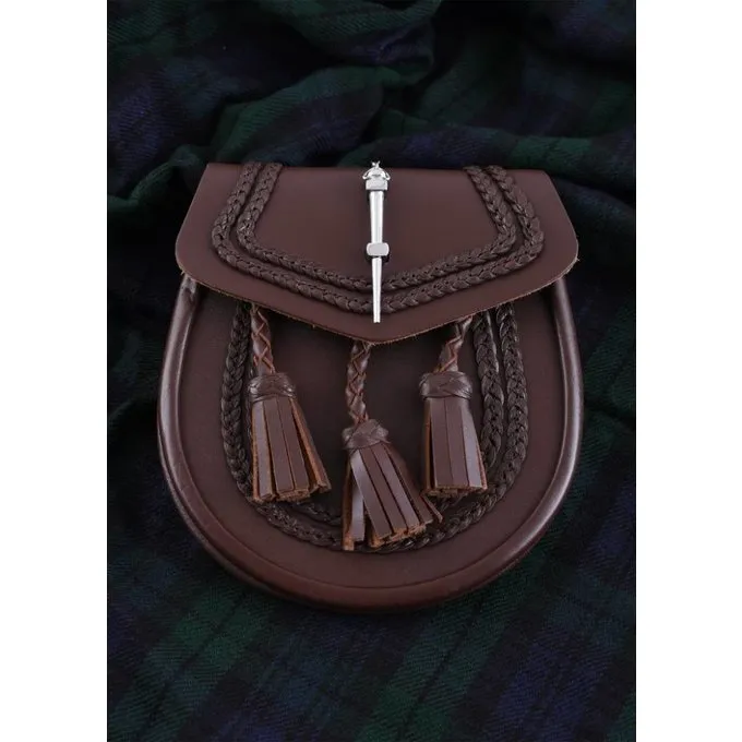 Deze sporran heeft drie leren kwastjes en is gedecoreerd met een leren vlechtmotief. Je kan hem dichtmaken met een bijgeleverde pin. De tas komt inclusief een ketting om de sporran rond de kilt te hangen.