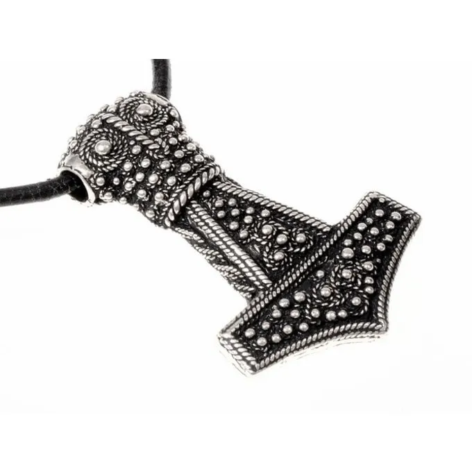 Deze prachtige Thorshamer is een replica van een 9de-10de eeuws origineel teruggevonden op het Zweedse eiland Oland. Vikingen droegen een brede diversiteit aan Thorshamers. Thorshamers zijn overal in de Vikingwereld teruggevonden. Deze Thorshamer is semi-gegranuleerd. Bij het origineel zijn de kleine bolletjes stuk voor stuk op de Thorshamer gesoldeerd. Deze replica is uit één stuk gegoten, wat het een stuk goedkoper maakt.
