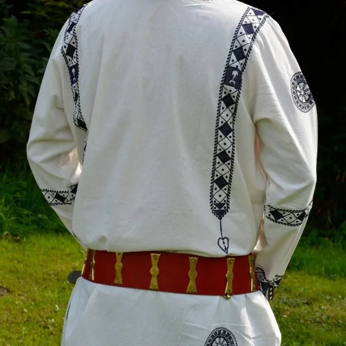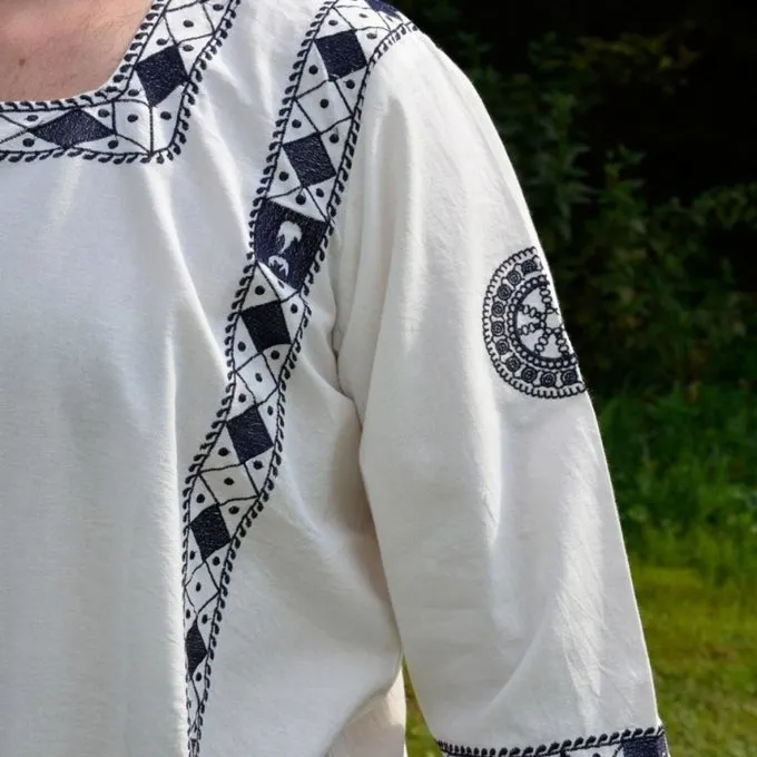 Deze tunica is van katoen gemaakt en is versierd met blauw geborduurde orbicula en clavi. Hij is verkrijgbaar in maat S t/m XXL.