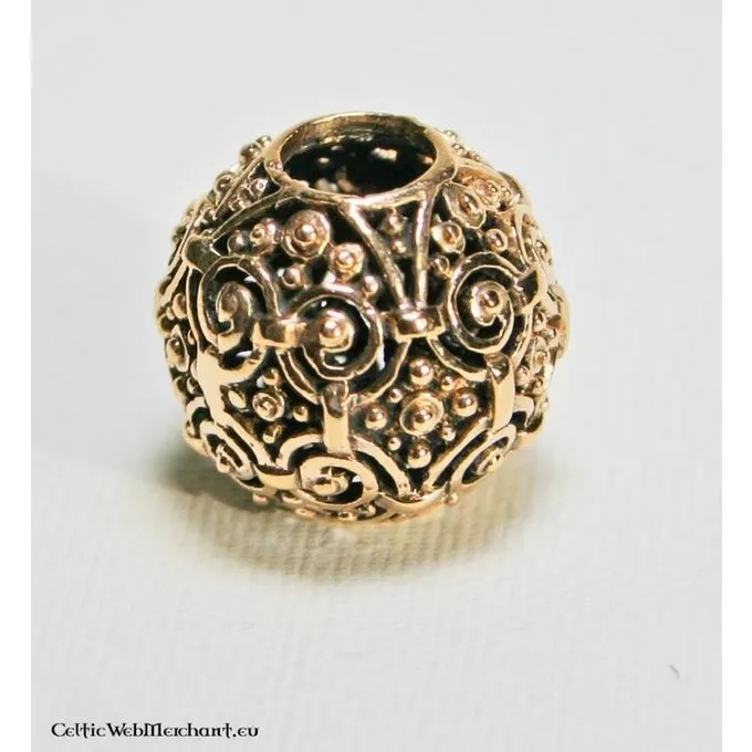 Deze kraal is gemaakt naar een 9de eeuws exemplaar teruggevonden in Gotland. Bronzen, zilveren en gouden kralen waren tijdens de vroege middeleeuwen populair bij alle volkeren van Europa.